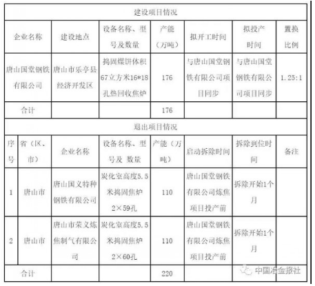 2019年8月,河北省工信廳發(fā)布《唐山國堂鋼鐵有限公司重組暨焦化搬遷改造項目焦炭產(chǎn)能置換方案公告》。